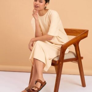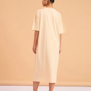 Brown Oversized Round Neck T-Shirt Dress, in Cotton Jersey fabric, Unlined , Midi Length, Oversized Fit, No Closure, Straight Hemline and features Ribbed Neck Detail