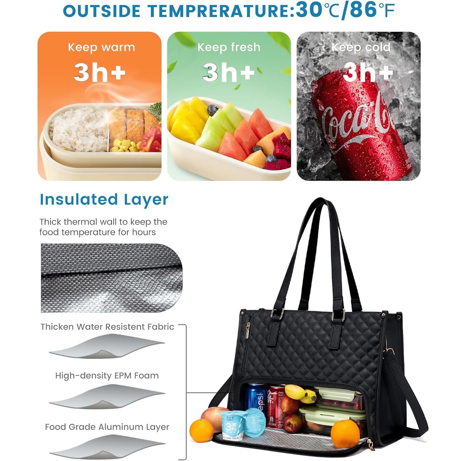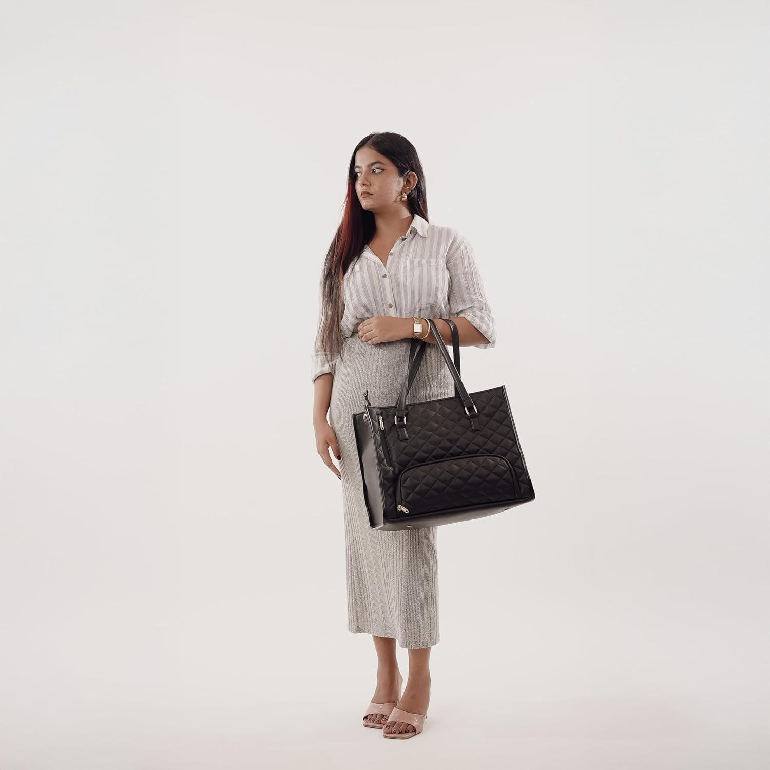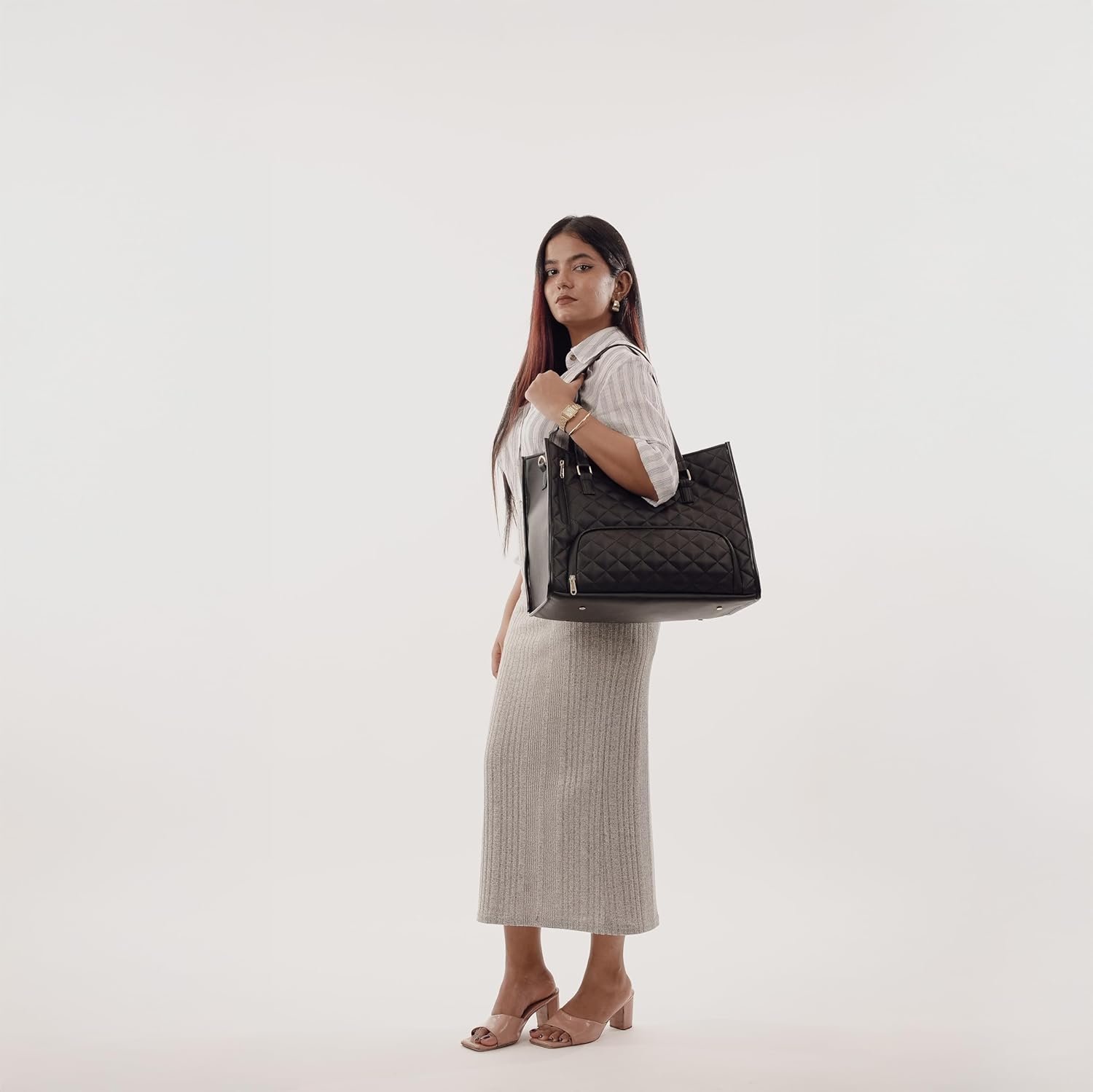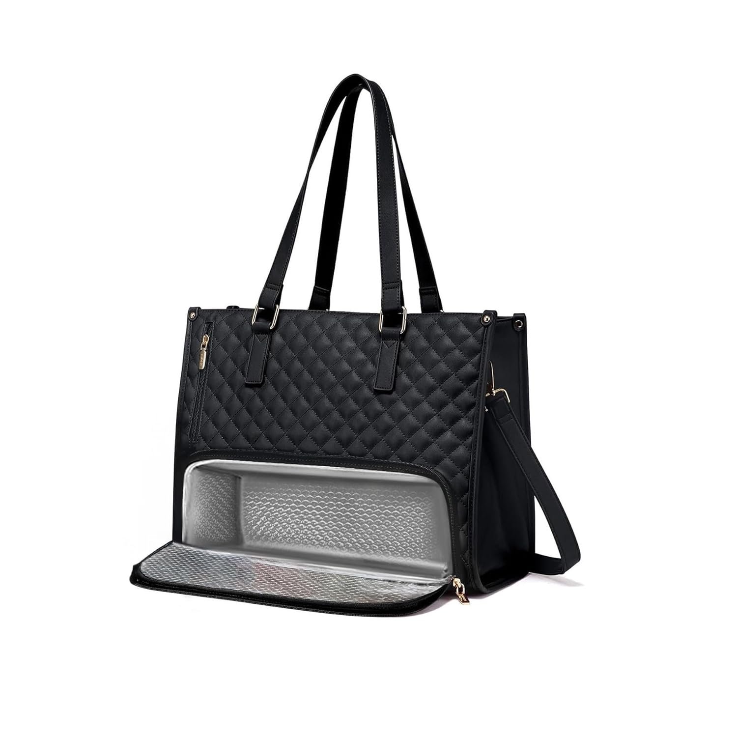 Elevate your professional style with this sophisticated quilted work bag that perfectly balances fashion and functionality. The innovative design features a dedicated insulated lunch compartment, allowing you to carry your meals alongside your work essentials while maintaining temperature control. The spacious main compartment accommodates laptops and documents, while the quilted exterior adds a touch of luxury to your everyday carry. Crafted with durable materials and adorned with elegant gold-tone hardware, this versatile tote includes comfortable shoulder straps and a matching quilted wristlet. The bag’s clever organisation helps separate your lunch containers, drinks, and snacks from your professional items, making it ideal for busy professionals who value both style and practicality. The classic black colour and timeless design ensure this bag coordinates seamlessly with any office attire, while its generous dimensions provide ample space for all your daily necessities