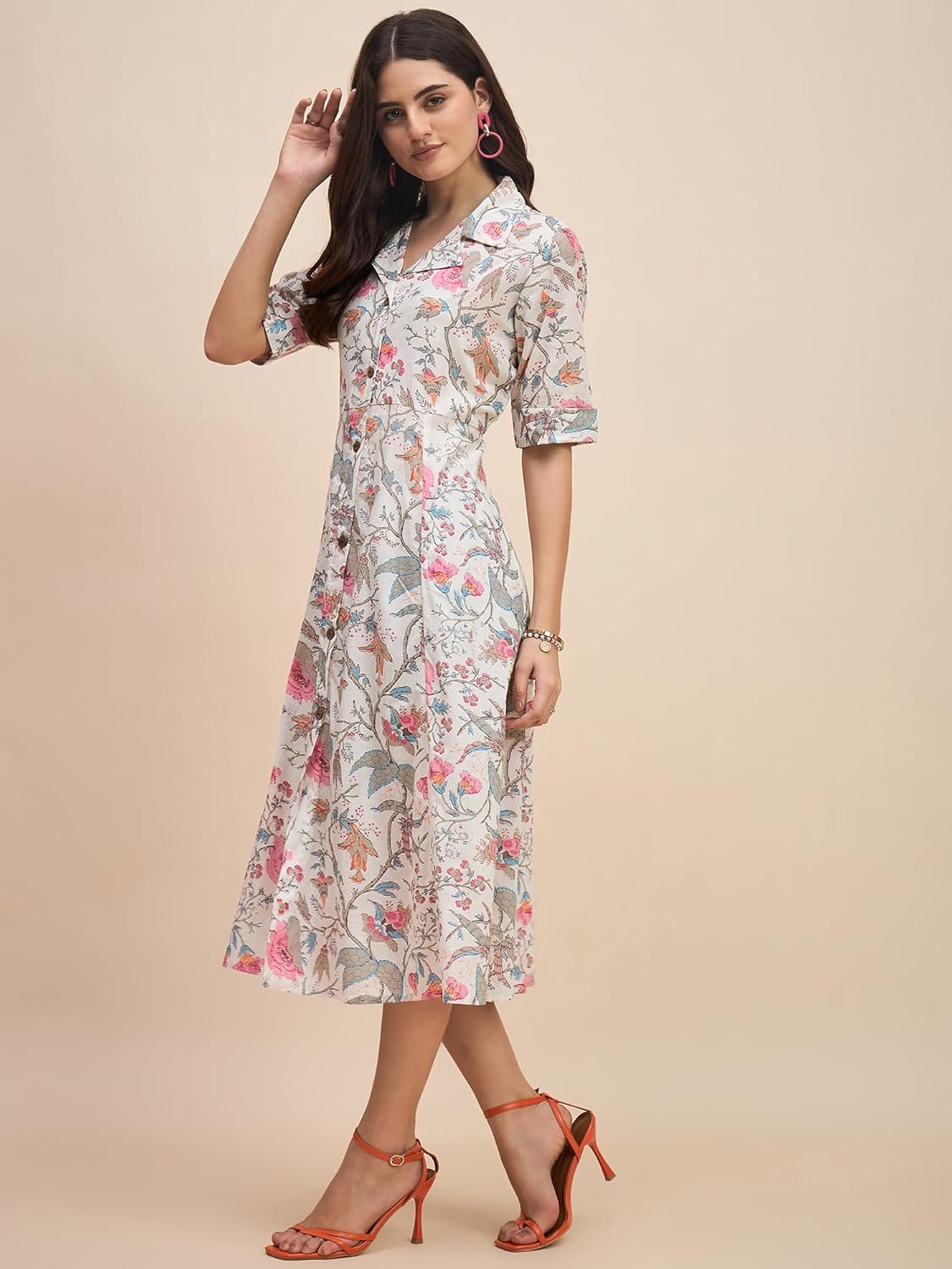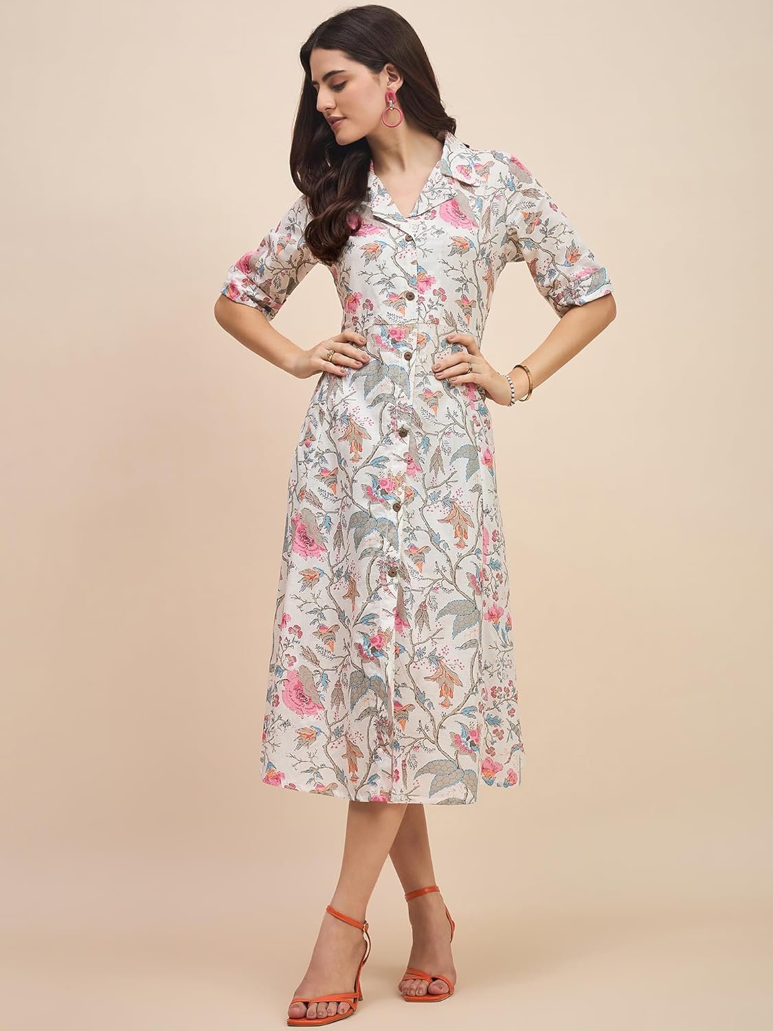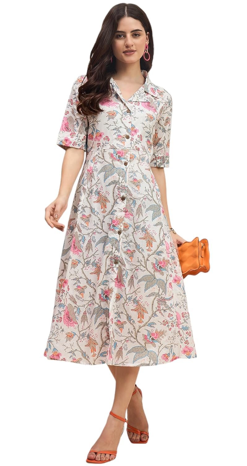 Cotton Shirt Dress for Women || Roll Tab Sleeve & Collared Neck Flared Dress Product Details