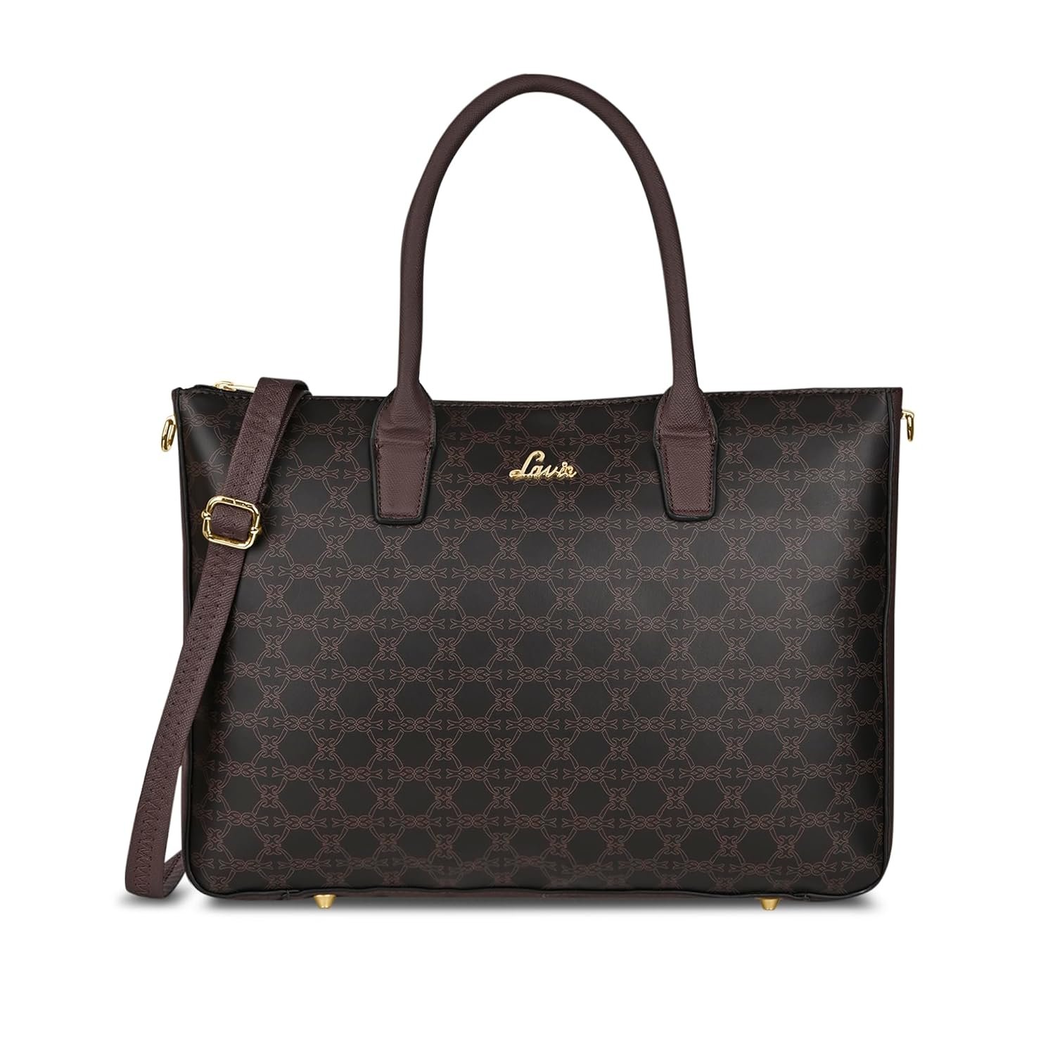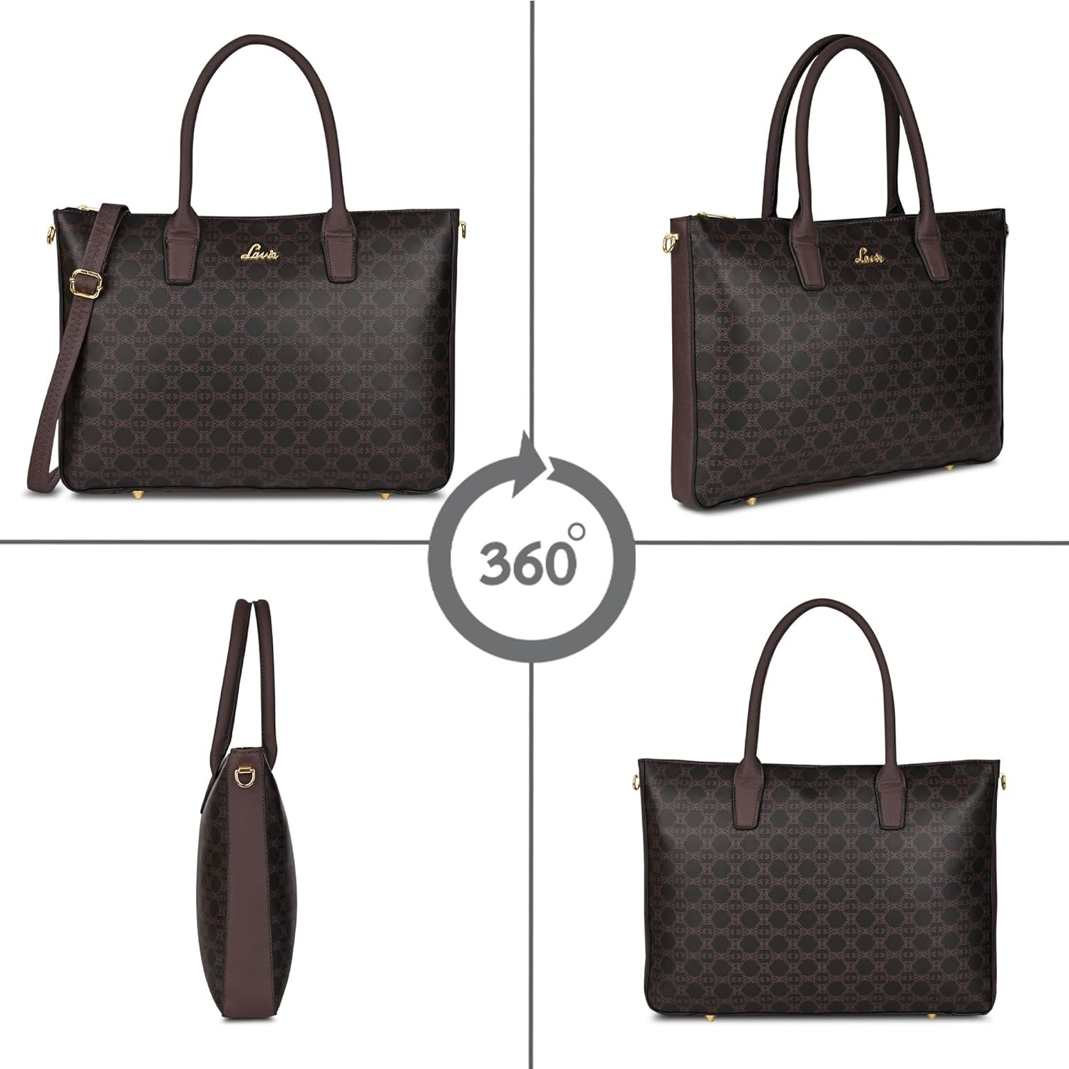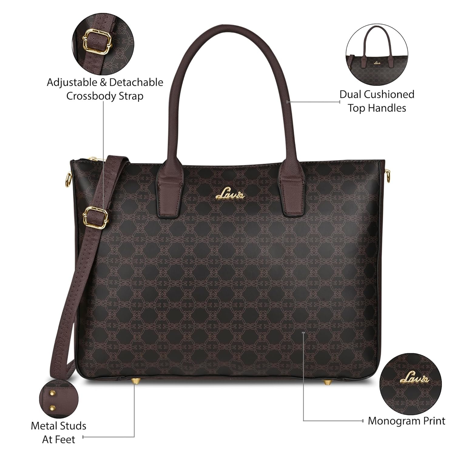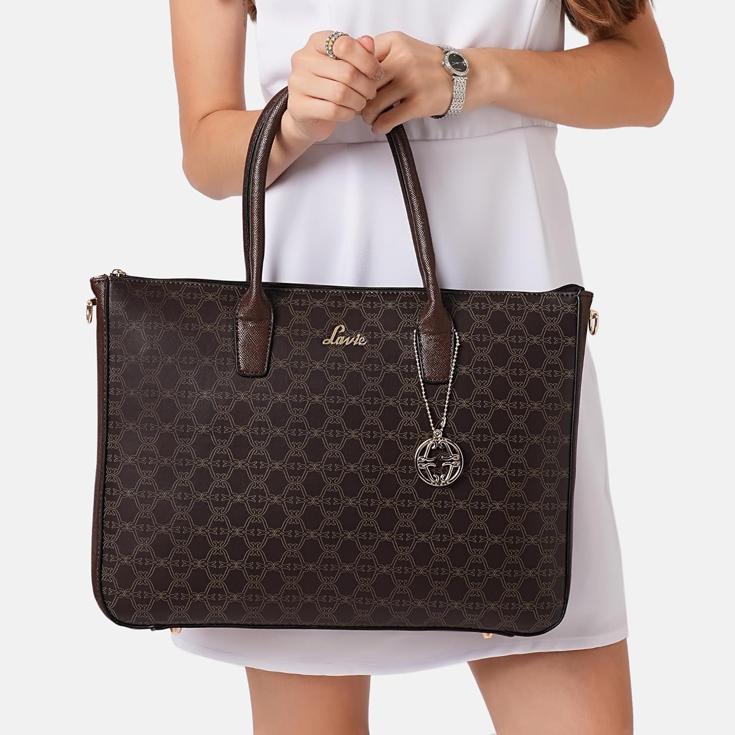 Large sized bag with monogram print & high shine logo on the front. Top zip closure for safety. The interior has 1 main compartment & an inner zip pocket. Round dual handles & adjustable sling strap.