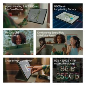 Customers find the tablet’s display sharp with good picture quality for media consumption, and appreciate its Dolby Atmos sound system with four speakers that even makes calls loud. The device performs smoothly, works fast, and offers good battery life with excellent charging capabilities. They consider it a great option for both work and entertainment, with one customer noting it’s ideal for binge-watching and music lovers. While some customers report no lag at all, others mention occasional performance issues.