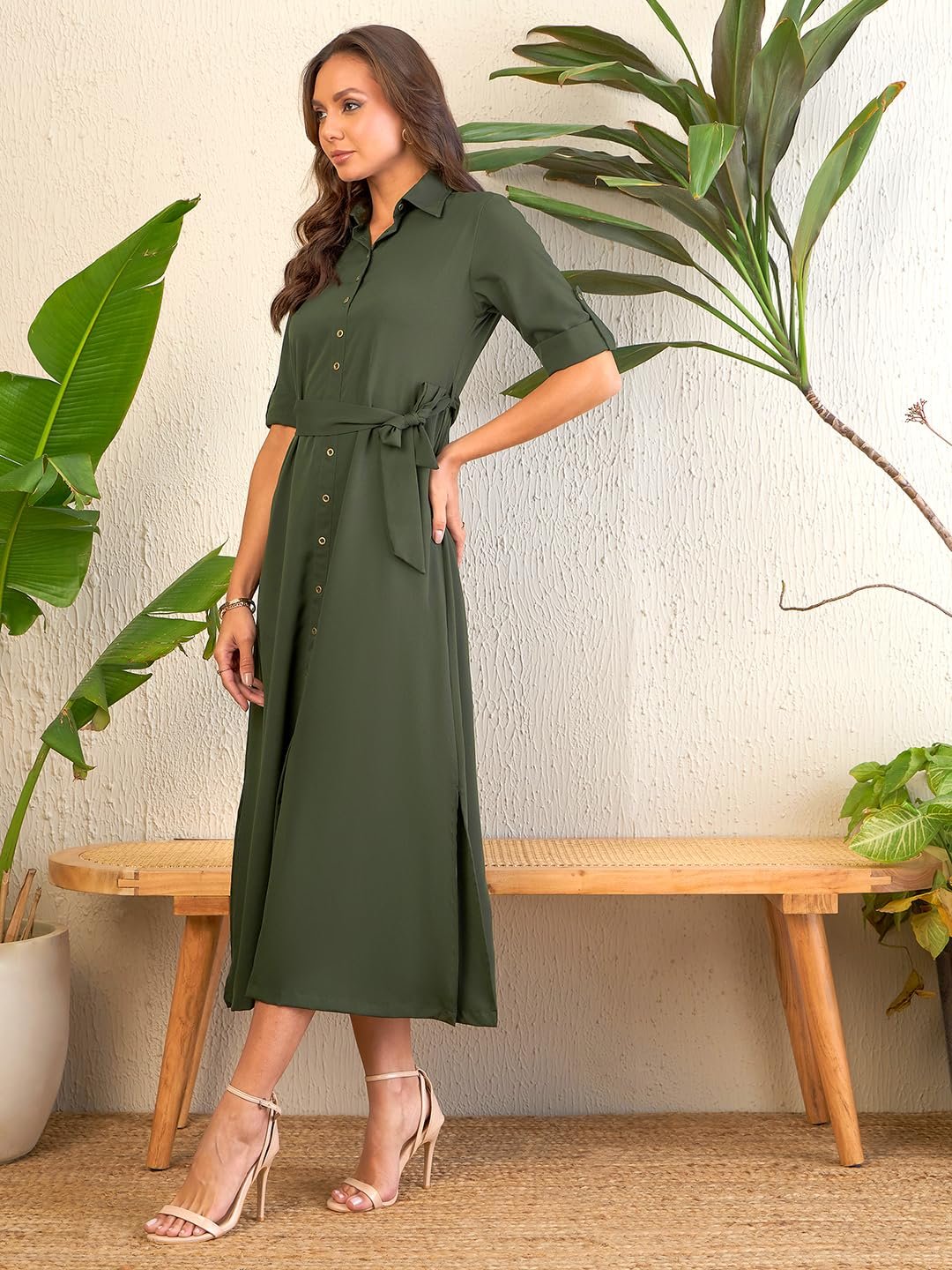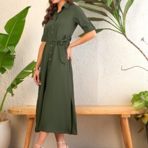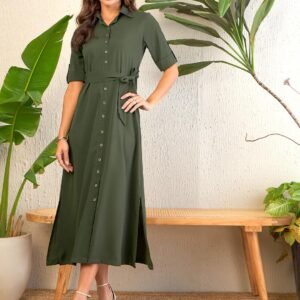 Buttoned Shirt Maxi Dress with side slits. The comfortable hip silhouette is perfect for the Indian body type. Tailored to relaxed fit, this dress will keep you comfortable all day long.